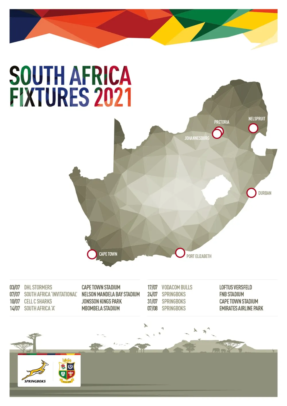 The Lions also play the Cell C Sharks at Jonsson Kings Park and the Vodacom Bulls at Loftus Versfeld, with the tour’s only two midweek matches being in Port Elizabeth and Nelspruit against South African Invitational and SA ‘A’ respectively.