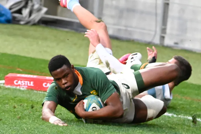 Springbok wing Aphelele Fassi scores a try during their Rugby Championship game against Argentina at Nelson Mandela Bay Stadium in Gqeberha on Saturday Springbok wing Aphelele Fassi scores a try during their Rugby Championship game against Argentina at Nelson Mandela Bay Stadium in Gqeberha on Saturday. Photo: Deryck Foster/BackpagePix