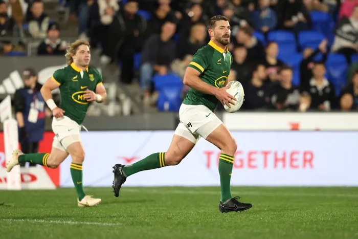 Willie le Roux of South Africa looks to pass the ball during the Rugby Championship Test match against New Zealand at Mt Smart Stadium in Auckland Willie le Roux of South Africa looks to pass the ball during the Rugby Championship Test match against New Zealand at Mt Smart Stadium in Auckland on July 15, 2023. Picture: Michael Bradley/AFP
