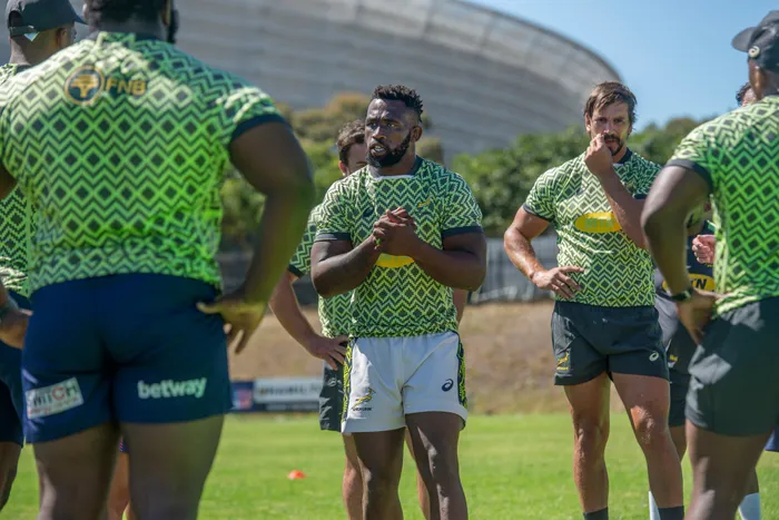 Springbok captain Siya Kolisi (centre) talks to his team during a training session, while Eben Etzebeth (right) looks on with the rest of the players. Siya Kolisi will lead a 33-man Springbok squad as they seek to defend their Rugby World Cup title. Picture: Armand Hough. African News Agency (ANA)