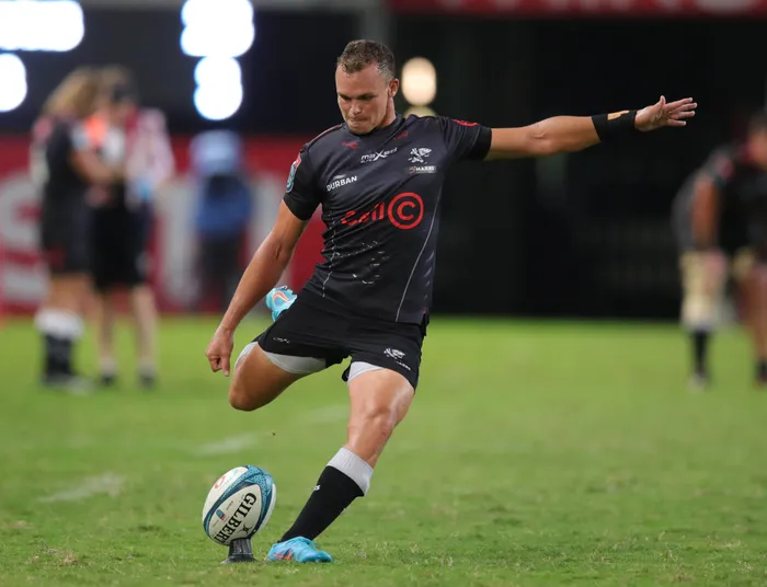 Curwin Bosch of the Sharks kicks a conversion during the United Rugby Championship 2021/2022 match between the Sharks and Dragons held at Kings Park in Durban on 01 April 2022. Picture: Samuel Shivambu/BackpagePix