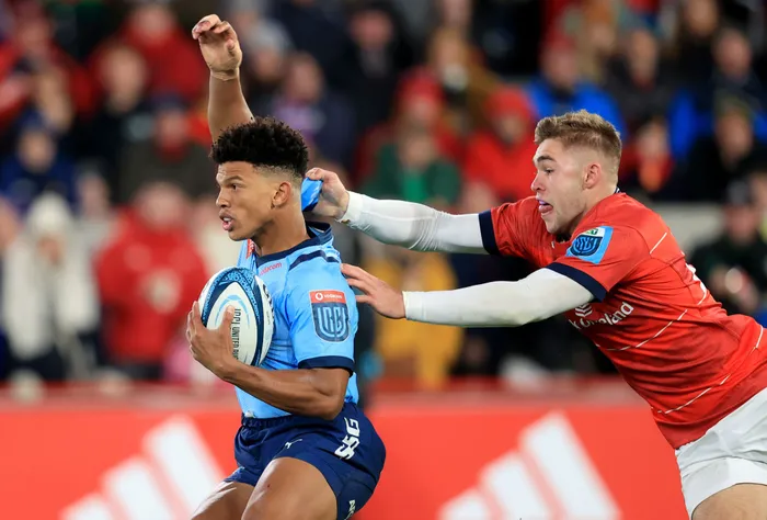 a rugby player runs with the ball while an opposition player attemps to bring him down by pulling on his jersey Bulls' Kurt-Lee Arendse is tackled by Munster’s Jack Crowley in their United Rugby Championship match, at Thomond Park, in Limerick on 15 October 2022. Picture: Dan Sheridan/INPHO/Shutterstock/BackpagePix