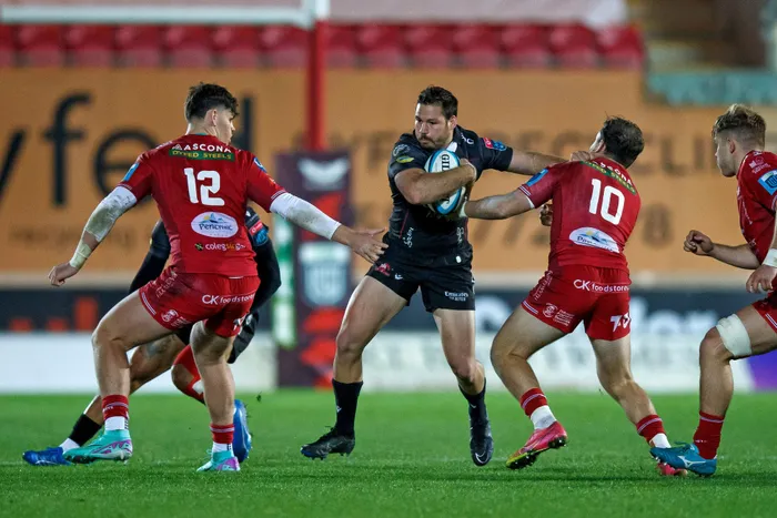 Marius Louw of Lions hands off Ioan Lloyd of Scarlets during a URC match. Marius Louw of Lions hands off Ioan Lloyd of Scarlets during a URC match. Picture: Huw Evans Agency / Shutterstock via Backpagepix