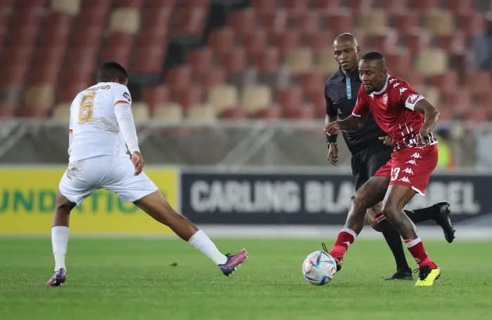 Linda Mntambo of Sekhukhune United is challenged by Shadrack Kobedi of Royal AM during their DStv Premiership match at Peter Mokaba Stadium in Polokwane on Saturday Linda Mntambo of Sekhukhune United is challenged by Shadrack Kobedi of Royal AM during their DStv Premiership match at Peter Mokaba Stadium in Polokwane on Saturday. Photo: Samuel Shivambu/BackpagePix