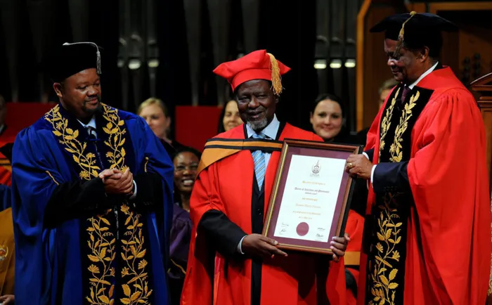 'YOU CAN DO MORE': Former Mozambican president Joaquim Chissano, centre, receives a doctorate from Unisa chancellor Judge President Bernard Ngoepe, right, and vice-chancellor Prof Mandla Makhanya, left. Academic institutions have a duty to recognise those who fought for democracy, says the writer. Picture: Phill Magakoe 'YOU CAN DO MORE': Former Mozambican president Joaquim Chissano, centre, receives a doctorate from Unisa chancellor Judge President Bernard Ngoepe, right, and vice-chancellor Prof Mandla Makhanya, left. Academic institutions have a duty to recognise those who fought for democracy, says the writer. Picture: Phill Magakoe
