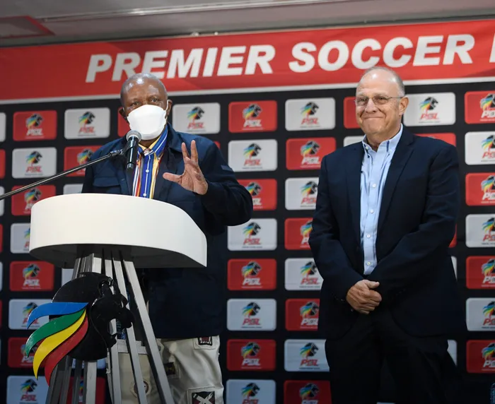 PSL chairman Irvin Khoza, left, and Laurence Michel of Betway address the media in Johannesburg yesterday. Photo: BackpagePix