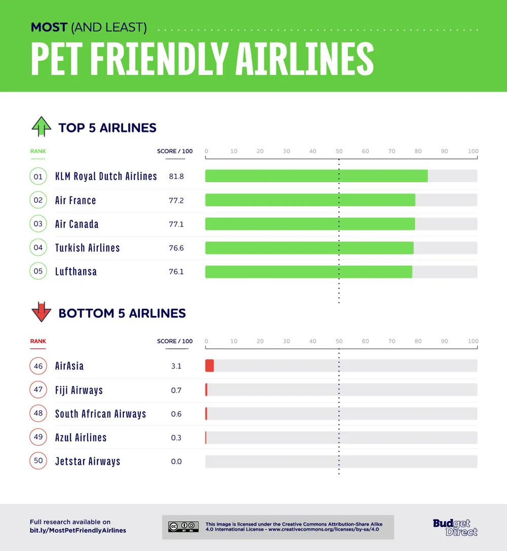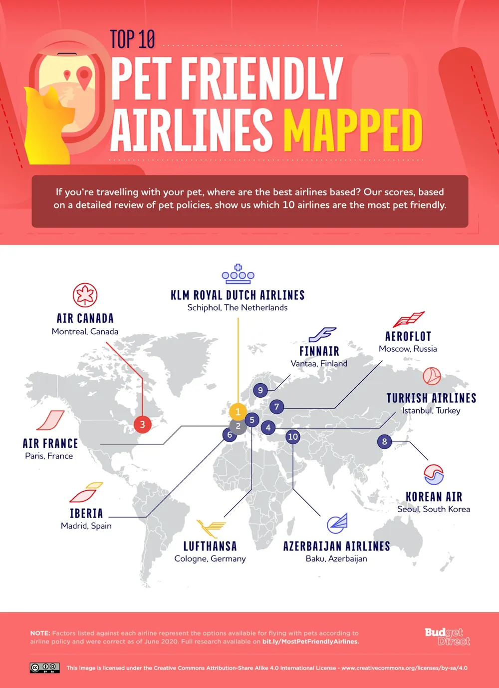 Budget Direct Travel Insurance conducted a detailed review of the pet policies of the top 50 airlines in the world, as ranked by the annual Skytrax airline rankings in 2019.