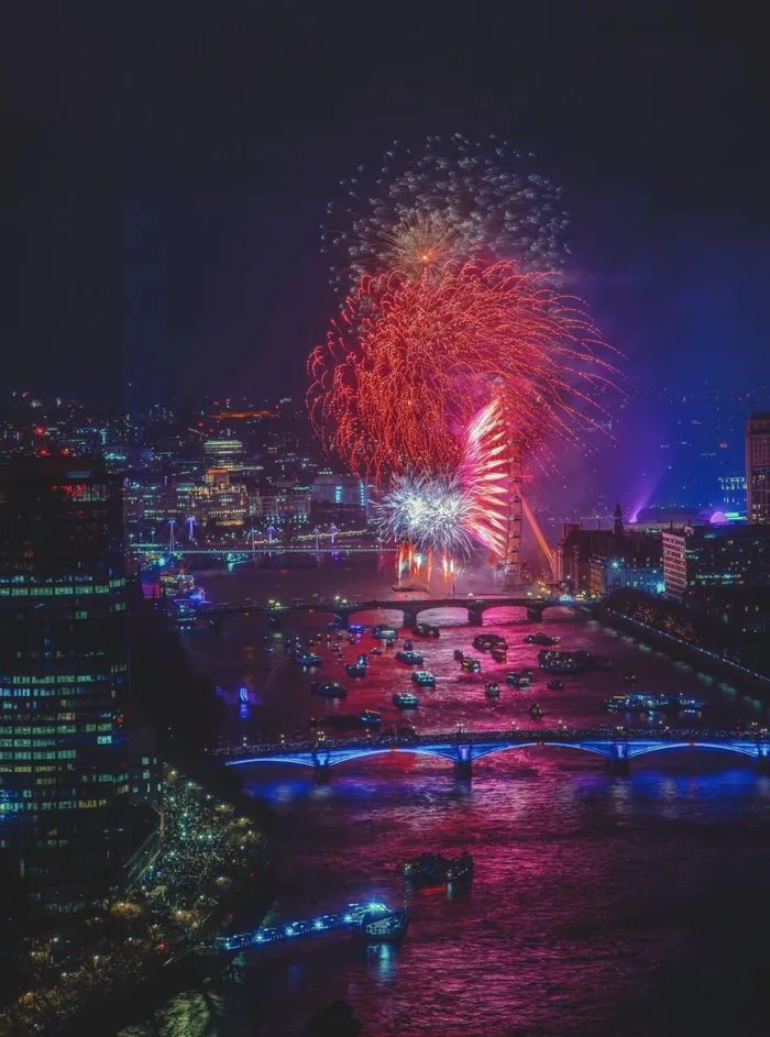 London’s New Year’s Eve celebrations are steeped in charm. Fireworks light up the sky along the Thames, framing landmarks like Big Ben and the London Eye.