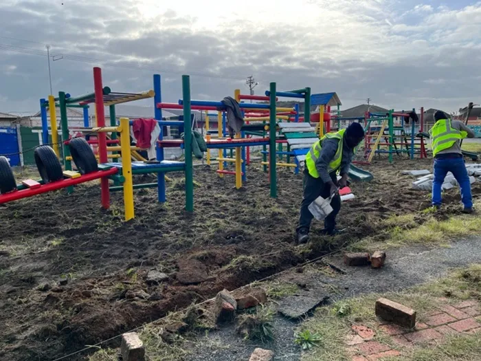 Work being undertaken at the St Francis Children’s Home in Athlone. The team is currently busy refurbishing the play area by levelling the ground and installing synthetic grass to make the play area safer. Photo: Supplied